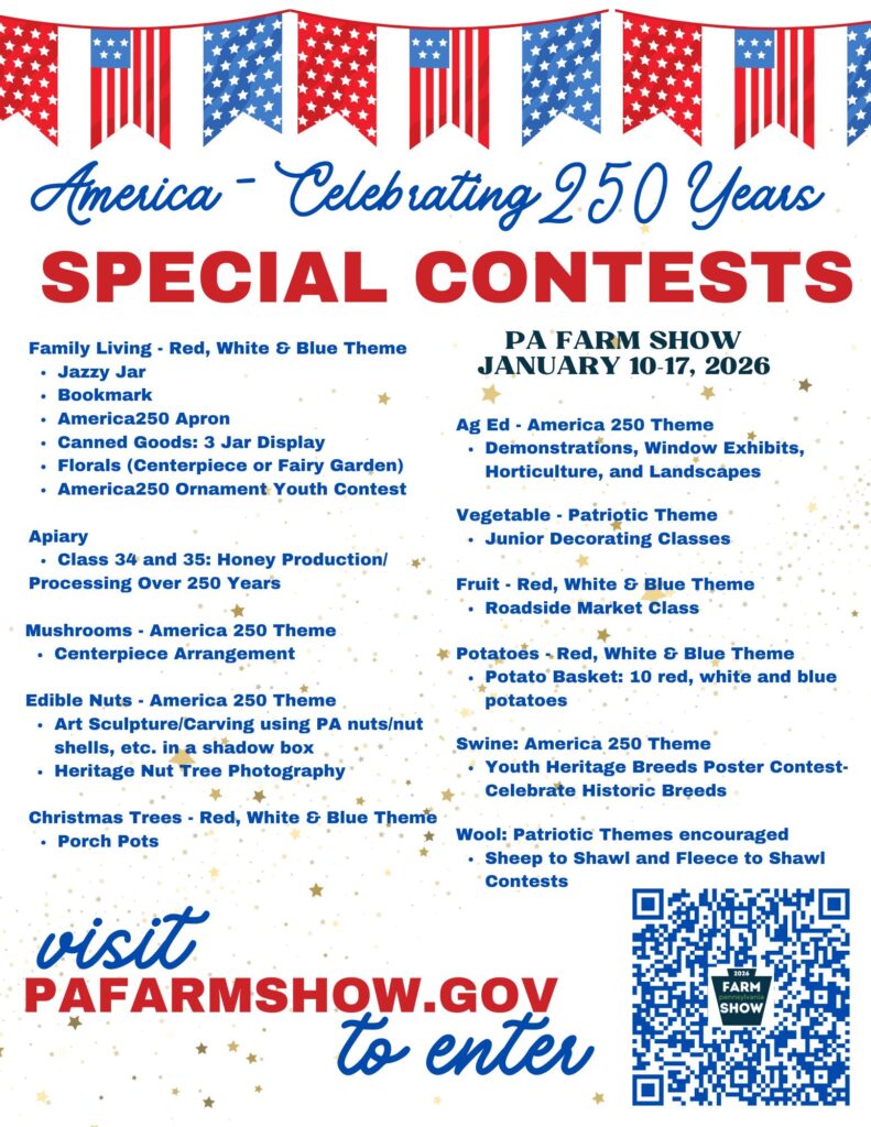 Celebrating 250 years of America! The PA Farm Show from January 10 – 17, 2026 will be having themed contests throughout the departments.